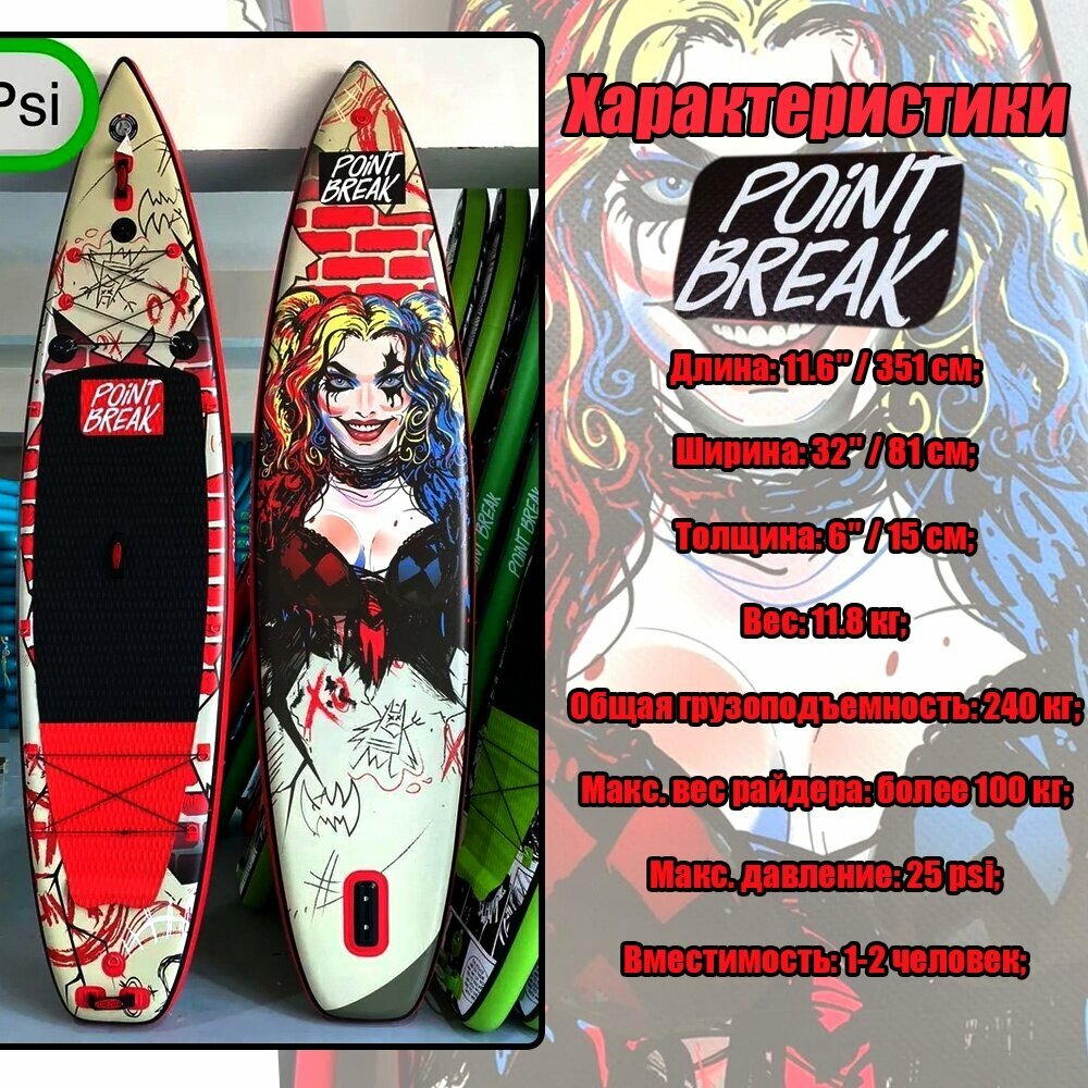 🔥Размеры сапдоски Point Break 11.6 ХАРЛИ КВИН — 351 сантиметра в длину и 81 в ширину. Толщина доски — 15 сантиметров. САПборд очень быстро развивает скорость и легко скользит по волнам, поэтому он отлично подойдет для заплывов.