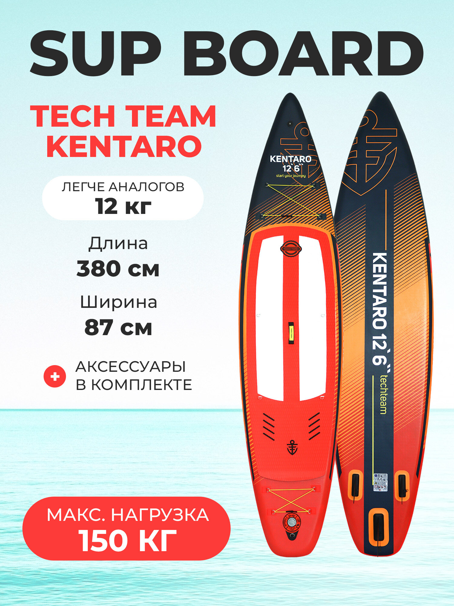 Сапборд TECH TEAM KENTARO 12,6 (красно-черный) NN014636 Габариты: 380×87×15 см (12,6’×34,5″×6″)Технология: Single Layer Drop Stitch, Double Layer SidewallMax нагрузка: 150 кг