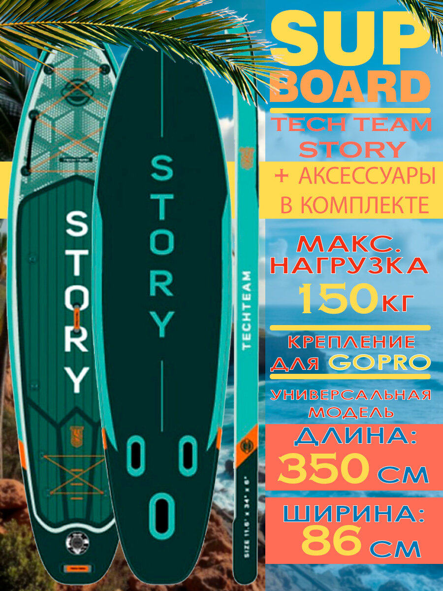 Сапборд TECH TEAM Story Emerald/Изумрудный 350x86x15 см NN014095Устойчивая универсальная модель Вес - 8,5 кг Габариты 350x86x15 см (11.6'х34"х6") Технология Single Layer Drop Stitch, Double Layer SidewallКомплектация:• Система фиксации для вещей (4 точечная)• Ручки для переноски• D-кольца• Крепление для GoPro• Весло алюминиевое (регулируемое,3х секционное)• Насос двойного действия с манометром• Комплект плавников(3шт), съемные, крепление Slide&Lock• Ремонтный комплект• Рюкзак для SUP доски и аксессуаров• Страховочный шнур (лиш)• Защитный чехол для телефона • Водонепроницаемый мешок 10 л • Ремень для переноски с подклакой • Инструкция• Картонная упаковка• Максимальная грузоподъемность - 150 кг