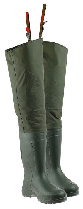 Болотники выполнены на базе модели TORVI универсал. К сапогу из материала ЭВА герметично прикреплён верх из нейлона с ПВХ покрытием. Имеют комфортную колодку. Просторное голенище сапога и специальная засечка на пятке позволяют легко снимать сапоги. Специальные наплывы из ЭВА защищают нос и пятку от случайных ударов.