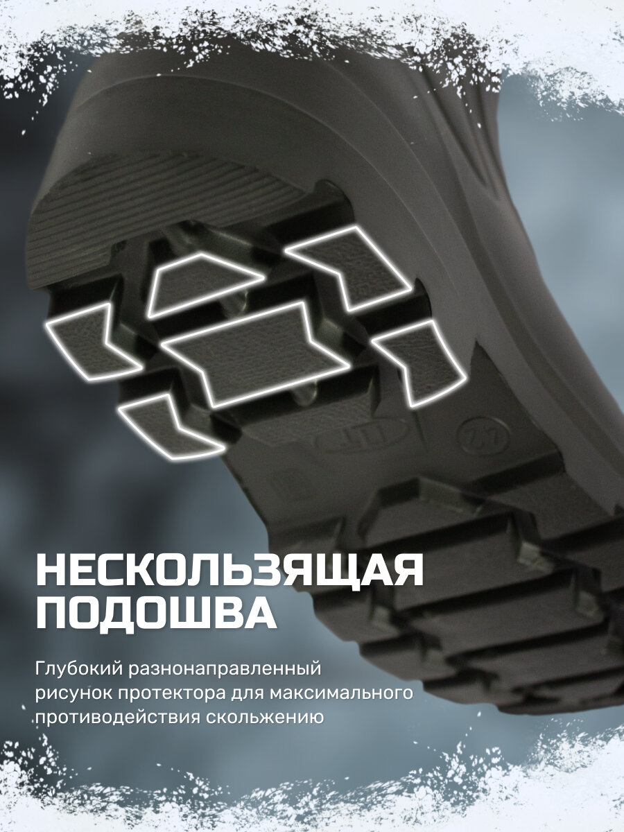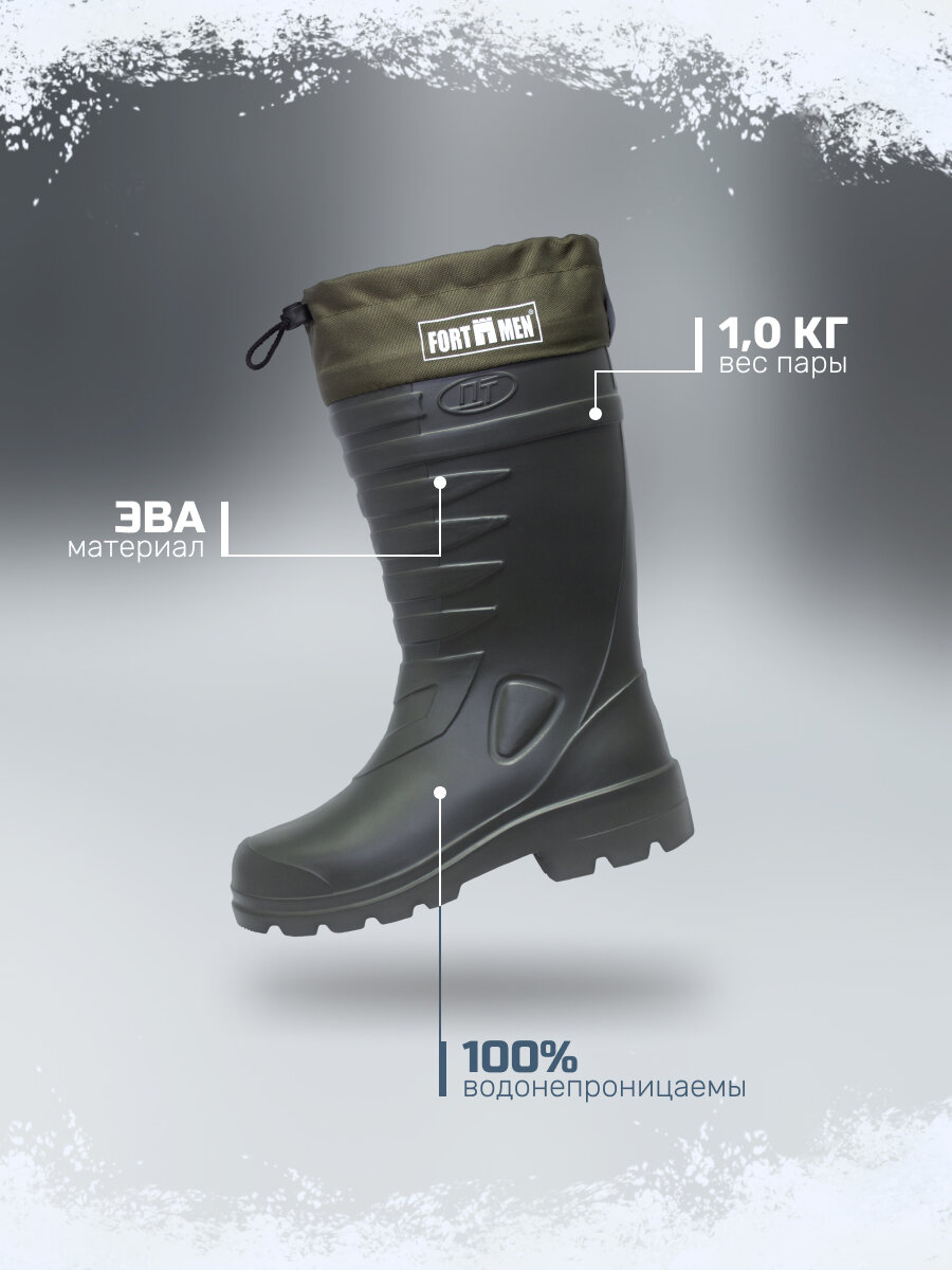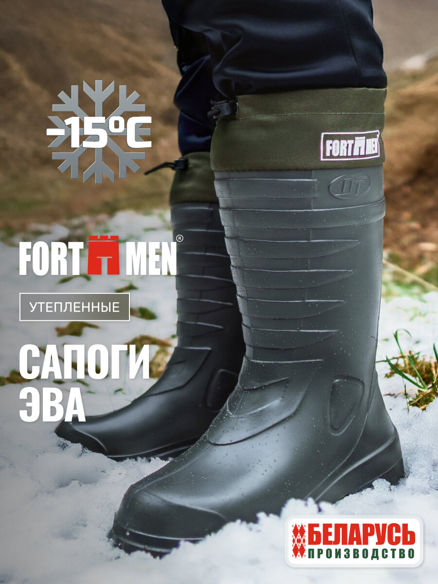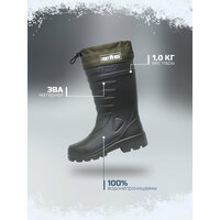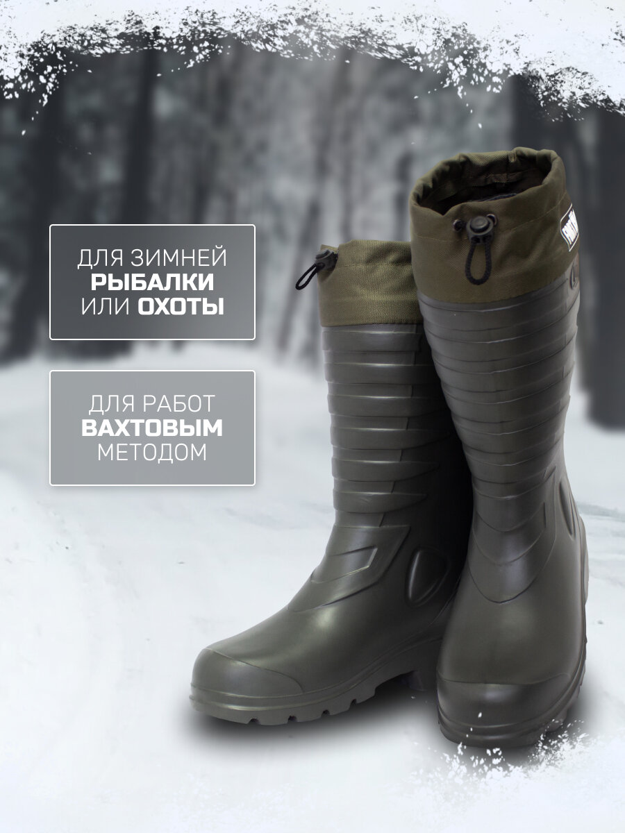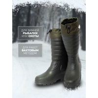 Сапоги резиновые мужские эва идеально подходят как для повседневного использования в качестве рабочей обуви, так и для активного отдыха, рыбалки или охоты. Сапоги эва мужские утепленные удобны для носки в демисезонный период, в холодную слякотную погоду, идеально подходят для периода снегокаш, комфортны в использовании при небольших морозах, в некоторых случаях ЭВА сапоги мужские до -20С. В теплое время года высокие мужские сапоги эва можно использовать и без вкладного утеплителя, в этом случае сапоги будут немного свободными по ноге. Сапоги зимние резиновые утепленные выполнены цельнолитыми из вспененного полимера - этиленвинилацетата (ЭВА), благодаря чему они на 100% водонепроницаемы, имеют очень легкий вес и хорошую теплоизоляцию. Сапоги укомплектованы вкладным утеплителем из ворсового иглопробивного материала, дублированного фольгированной мембраной, которая образует барьер против потери внутреннего тепла и проникновения влаги в случае образования конденсата. Сапоги пенки мужские снабжены текстильной манжетой с утяжкой на фиксаторе, против попадания внутрь мелкому мусору и влаге через широкий верх голенища. Манжеты снабжены светоотражающими элементами, которые не оставят вас незаметными в темное время суток. Протектор подошвы выполнен глубоким и имеет разнонаправленный рисунок. Сапоги мужские резиновые для рыбалки устойчивы к скольжению по обледенелым поверхностям. Сапоги для охоты и рыбалки зимние имеют удобную форму и широкий подъем, средняя высота голенища 40 см. Сушить и хранить эва обувь зимнюю необходимо вдали от источников тепла. Материал ЭВА очень легко чистится от загрязнений влажной губкой и высыхает моментально. Зимние рыболовные мужские сапоги мужские будут отличным подарком для любителей зимней рыбалки, потому как обувь эва мужская в комплектации с утеплителем отлично сохраняет тепло.