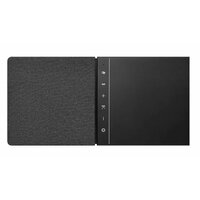 Система получила 17 динамиков, восемь из которых — сабвуферы. Поэтому Dione может удивить шириной своей АЧХ: от 24 Гц до 21 кГц. Суммарная мощность — 950 Вт RMS. Максимальное звуковое давление — 101 дБ SPL. Максимальное качество звука — 24 бит / 96 кГц. Шарик под названием Orb отвечает за центральный канал саундбара. Он «механически и акустически» адаптируется под расположение Dione. Вообще устройство можно как повесить на стену, так и положить перед телевизором: Саундбар зрительно разделён на три части. По бокам от центральной части расположены обозначения. На одной из них написано Devialet, а на другой — сенсорные кнопки управления Dione: Из физических разъёмов Dione получил HDMI 2.1 eARC, оптический SPDIF и гигабитный Ethernet. Также саундбар получил поддержку AirPlay 2, Spotify Connect, Bluetooth 5.0 и UPnP. К сети можно подключиться не только по проводу, но и с помощью Wi-Fi. Он тут двухдиапазонный. Саундбар получил поддержку Dolby Atmos с имитацией звука 5.1.2, играя звук практически по всем окружающим 360°. Также тут реализована технология SPACE, преобразующая монофонические и стереофонические записи в сигнал 5.1.2. Пространственное звучание настраивается с помощью четырёх калибровочных микрофонов, встроенных прямо в систему. Они улавливают все возможные отражения и подстраивают звук конкретно под вашу комнату.