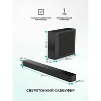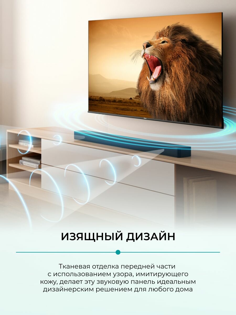 Эта акустическая система включает в себя сабвуфер диаметром 110 мм, который добавляет мощные низкие частоты, позволяя вам насладиться любимыми сценами с эффектом полного погружения. Саундбар подходит для телевизоров и легко интегрируется с различными устройствами, что делает его отличным выбором для тех, кто ищет удобное и качественное решение для аудиовоспроизведения.