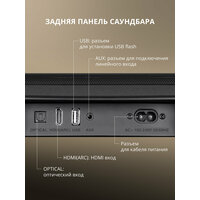 Саундбар — 1 шт. Пульт дистанционного управления (ПДУ) — 1 шт. Элементы питания типа ААА — 2 шт. Сигнальный кабель mini-jack к mini-jack — 1 шт. Оптический кабель — 1 шт. Кабель питания — 1 шт. Угловой HDMI переходник — 1 шт. Монтажный шаблон - 1 шт Комплект для крепления на стену — 1 шт. Руководство по эксплуатации — 1 шт. Гарантийный талон — 1 шт.