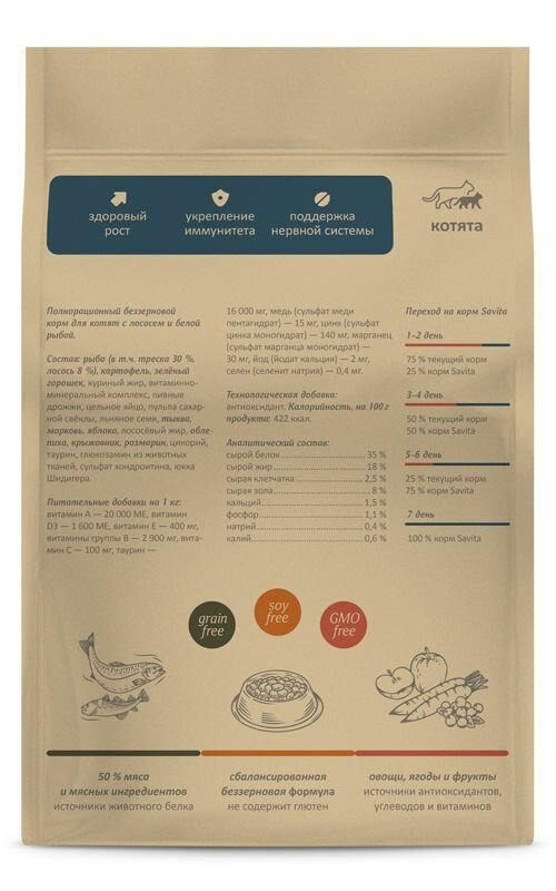Savita класса холистик содержат высокий процент мясных ингредиентов, необходимых витаминов и минералов, без добавления зерновых культур в составе. Надолго обеспечивают кошку необходимой энергией на весь день Каждый ингредиент тщательно подобран в соответствии с природными потребностями питомца и является важным компонентом в рецептуре корма, минимизируя риск возникновения аллергических реакций.