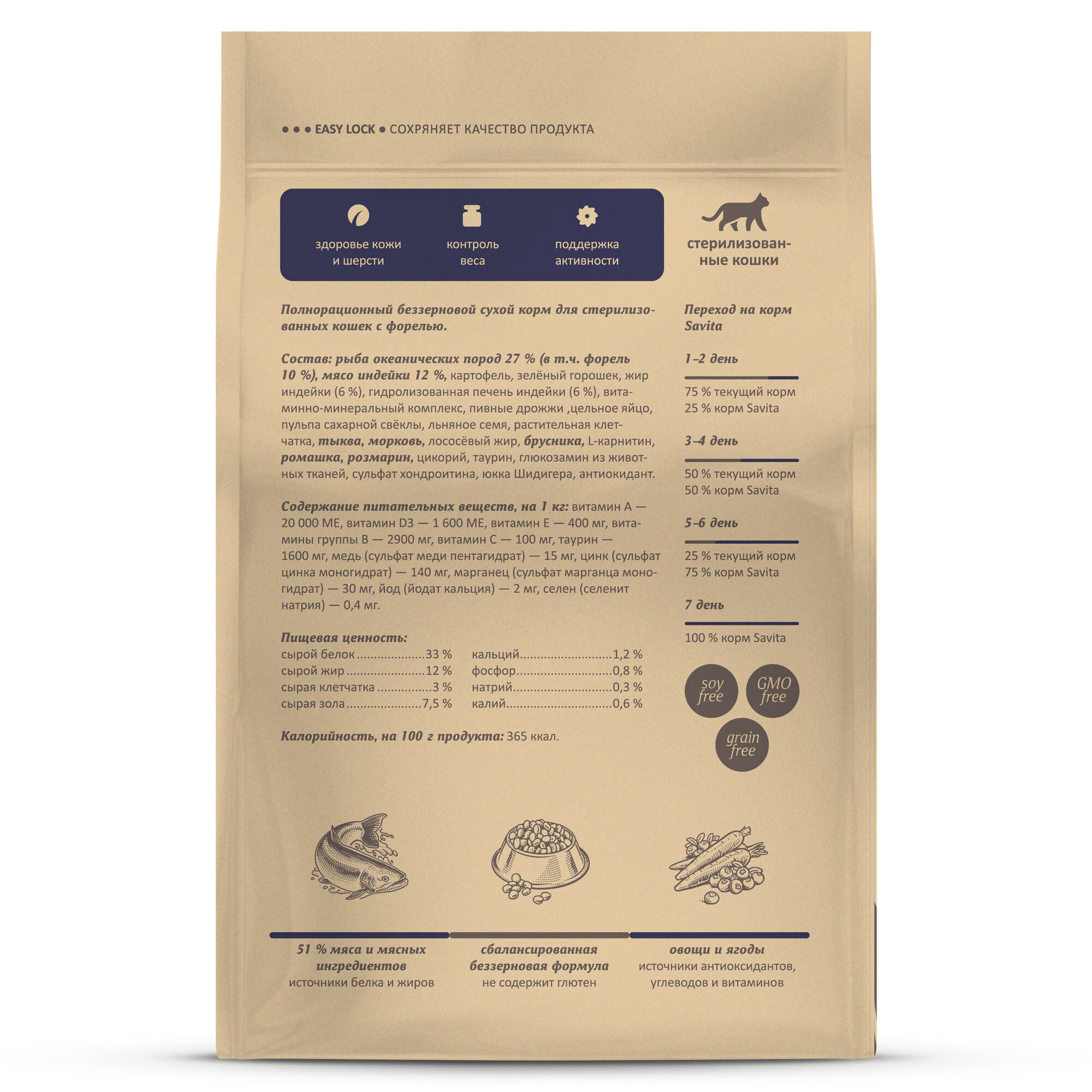 Savita - с уважением к дикой природе Вашего питомца Польза природных ингредиентов и многолетний опыт, объединённые с эффективностью современных технологий Полнорационные и сбалансированные корма Savita класса холистик содержат высокий процент мясных ингредиентов, необходимых витаминов и минералов, без добавления зерновых культур в составе. Надолго обеспечивают кошку необходимой энергией на весь день Каждый ингредиент тщательно подобран в соответствии с природными потребностями питомца и является важным компонентом в рецептуре корма, минимизируя риск возникновения аллергических реакций. Преимущества корма: - беззерновая формула; - высокий процент мяса и мясных ингредиентов; - корма изготовлены из натурального сырья по стандарту качества human grade, - не содержат ГМО, сои, ароматизаторов, искусственных консервантов и красителей; - составы сухих кормов включают пребиотики, необходимые для здорового пищеварения питомца; - овощи, фрукты, ягоды и травы в составах являются источниками антиоксидантов, витаминов и минералов. - Форель - источник высокоусвояемого белка, омега - 3 жирных кислот, которые необходимы для здоровья кожи и шерсти, а также нормального обмена веществ. Размер гранул: 7,5-8,5 мм. Рекомендации по кормлению: Нормы кормления Вес, кг Суточная норма, г Менее активные кошки Более активные кошки 1 17-20 25-30 2 27-31 40-45 3 35-40 53-58 4 42-49 64-69 5 49-57 73-78 6 55-64 82-87 7 61-71 93-98 8 67-78 100-105 Состав: рыба океанических пород 27% (в т. ч. форель 10%), мясо индейки 12%, картофель, зелёный горошек, жир индейки (6%), гидролизованная печень индейки (6%), витаминно-минеральный комплекс, пивные дрожжи , цельное яйцо, пульпа сахарной свёклы, льняное семя, растительная клетчатка, тыква, морковь , лососёвый жир, брусника, L-карнитин, ромашка, розмарин, цикорий, таурин, глюкозамин из животных тканей, сульфат хондроитина, юкка Шидигера, антиокидант. Питательная ценность: сырой белок 33%, сырой жир 12%, сырая клетчатка 3%, сырая зола 8%, кальций 1,2%, фосфор 0,8%, натрий 0,3%, калий 0,6%. Питательные добавки на 1 кг: витамин A 20 000 МЕ, витамин D3 1 600 МЕ, витамин E 400 мг, витамины группы В 2900 мг, витамин C 100 мг, таурин 16000 мг, медь (сульфат меди пентагидрат) 15 мг, цинк (сульфат цинка моногидрат) 140 мг, марганец (сульфат марганца моногидрат) 30 мг, йод (йодат кальция) 2 мг, селен (селенит натрия) 0,4 мг. Калорийность на 100 г: 365 кКал