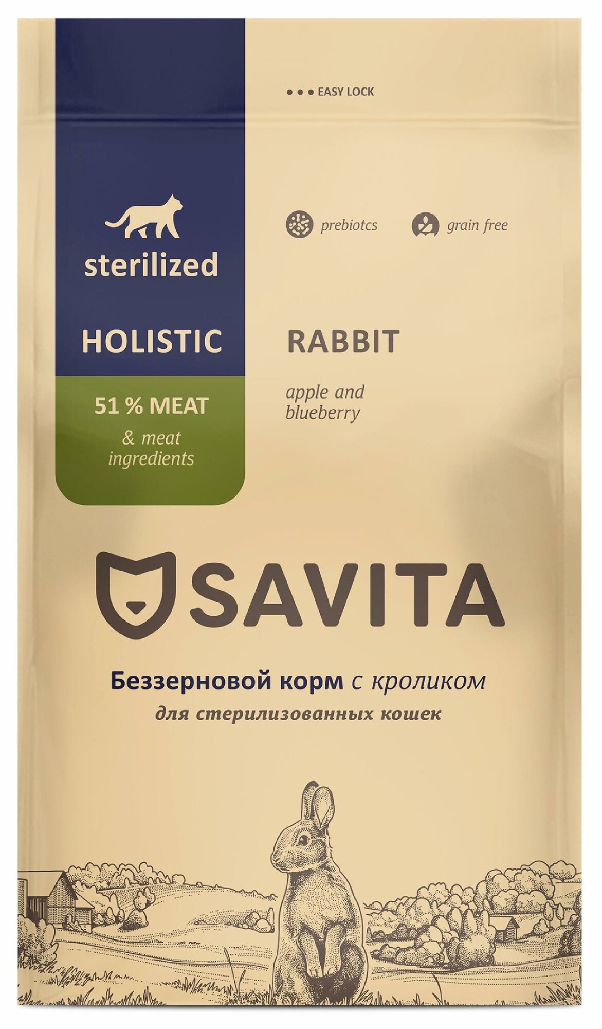 Беззерновой сухой корм Savita для стерилизованных кошек с кроликом, GRAIN FREE STERILISED, Rabbit - с заботой о питомце!