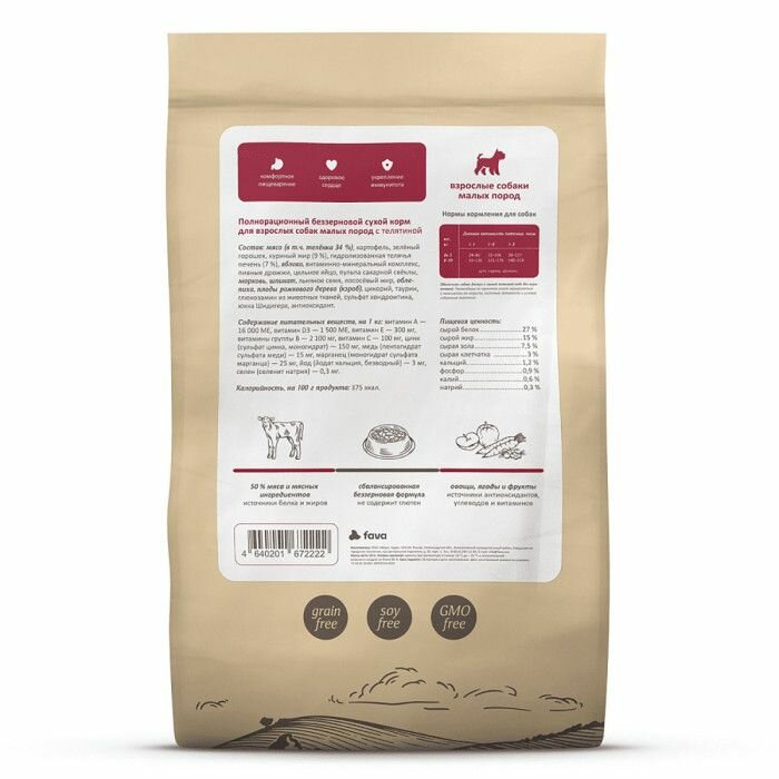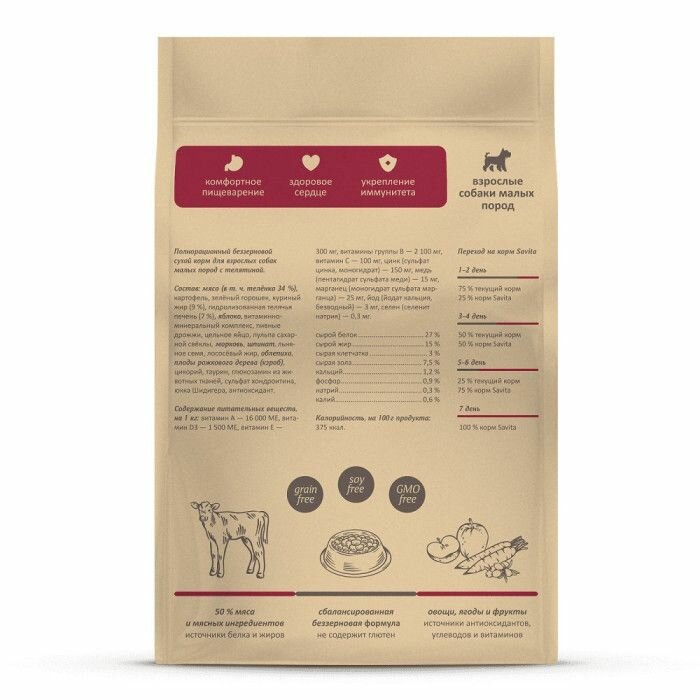 Беззерновой сухой корм для взрослых собак маленьких пород с телятиной, морковью и облепихой.