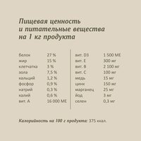 | Пищевая ценность | Сырой белок: 26% Сырой жир:16% Сырая зола: 7% Сырая клетчатка: 3% Влажность: 9% Кальций 1,2% Фосфор 0,9% Омега-3: 0,28% Омега-6: 3% |