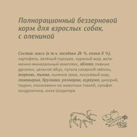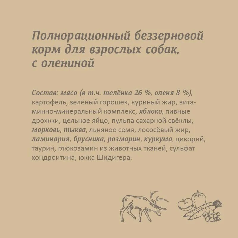 Мясо (в т. ч. теленка 26%, оленя 8%), картофель, зеленый горошек, куриный жир , натуральная вкусовая добавка из куриной печени, витаминно-минеральный премикс, пивные дрожжи , пульпа сахарной свеклы, льняное семя, лососевый жир, цельное яйцо, ламинария, брусника , розмарин, куркума, экстракт бархатцев прямостоячих, цикорий , глюкозамин из животных тканей, сульфат хондроитина, юкка Шидигера