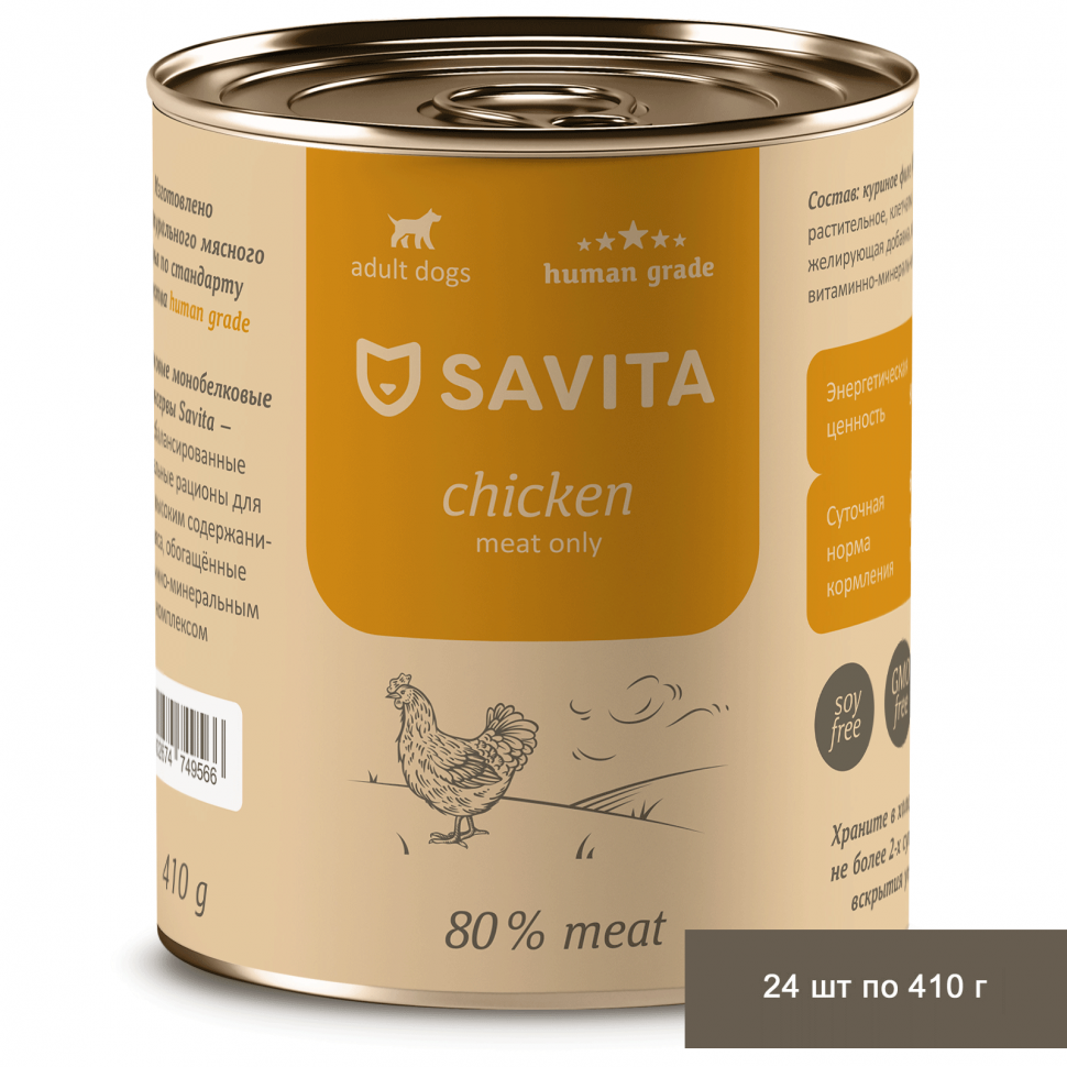 SAVITA консервы для собак «Курица». Влажный корм, 24шт по 410гр: сравнение цен, характеристики, фото, актуальное наличие и цены.