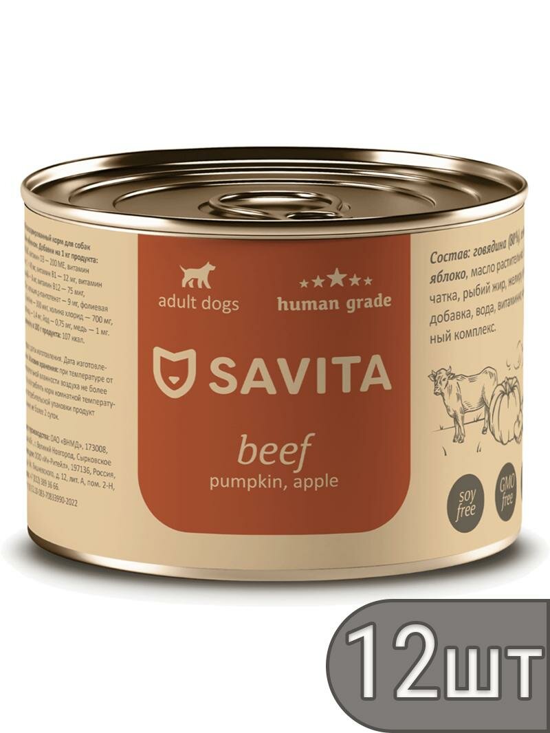 Купить SAVITA Набор 12 шт Консервы для собак Говядина с тыквой и яблоком, 240г 2.88 кг с доставкой по всей России.