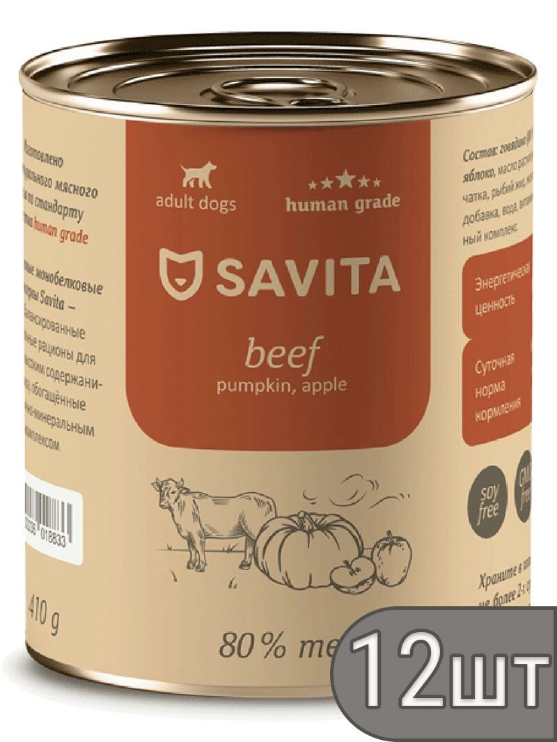 Купить SAVITA Набор 12 шт Консервы для собак Говядина с тыквой и яблоком, 410г 4.92 кг с доставкой по всей России.
