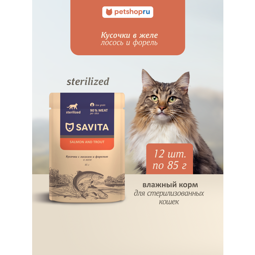 SAVITA влажный корм, паучи для стерилизованных кошек с лососем и форелью в желе