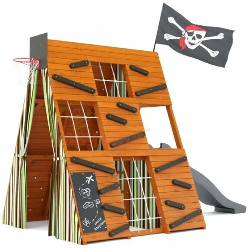 В домике есть все, чтобы создать собственный мир игры и приключений: многосекционный скалодром с пластиковыми и деревянными зацепами, гладиаторские разноуровневые сетки, меловая доска для рисования и творчества, бинокль и даже баскетбольное кольцо со щитом. Внутренние габариты игрового пространства – 2,4 х 1,4 м. Внутренний лаз с выходом на платформу и внутренняя лестница - это еще больше возможностей для детского творчества и активного отдыха.