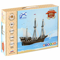 Фрегат "Орёл" станет отличным сюрпризом для любителей сборных моделей и подойдет для моделистов от 10 лет. Процесс его сборки подарит много часов за увлекательным занятием, а готовый фрегат можно покрасить, чтобы подарить близкому человеку или украсить им интерьер. Фрегат "Орел" - это прототип первых парусных военных кораблей, построенный по указу Алексея Михайловича. Строительство корабля длилось два года, в 1668 году он был спущен на воду, а в 1669 году ему было присвоено громкое красивое название "Орел". Модель имеет хорошо воссозданную палубу, 3 мачты, паруса, стропы, отверстия с пушечными орудиями внутри и подставку в форме морских волн. Корпус корабля, имеющий выраженную структуру досок, окрашен в темно-коричневый цвет.