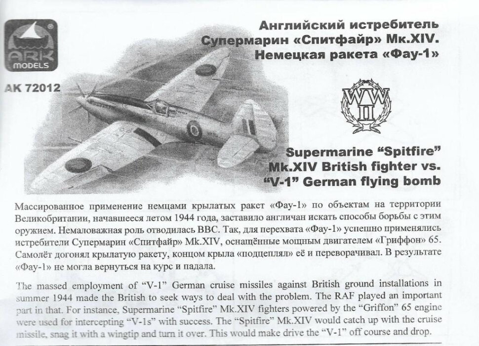 Сборная модель британского истребителя Спитфаер Мк. XIV и немецкая ракета Фау-1 (1/72) 72012 АRКmodels: сравнение цен, характеристики, фото, актуальное наличие и цены.