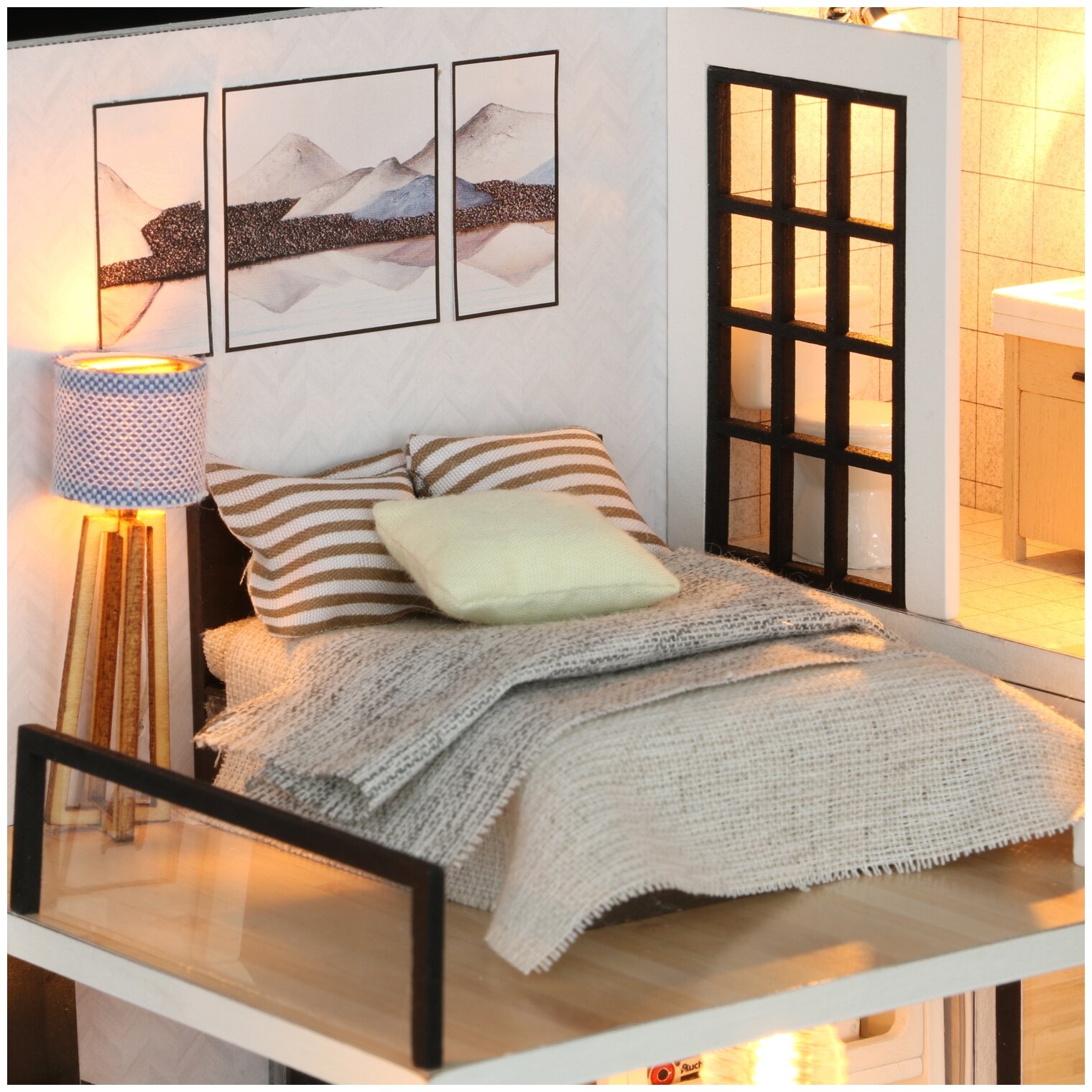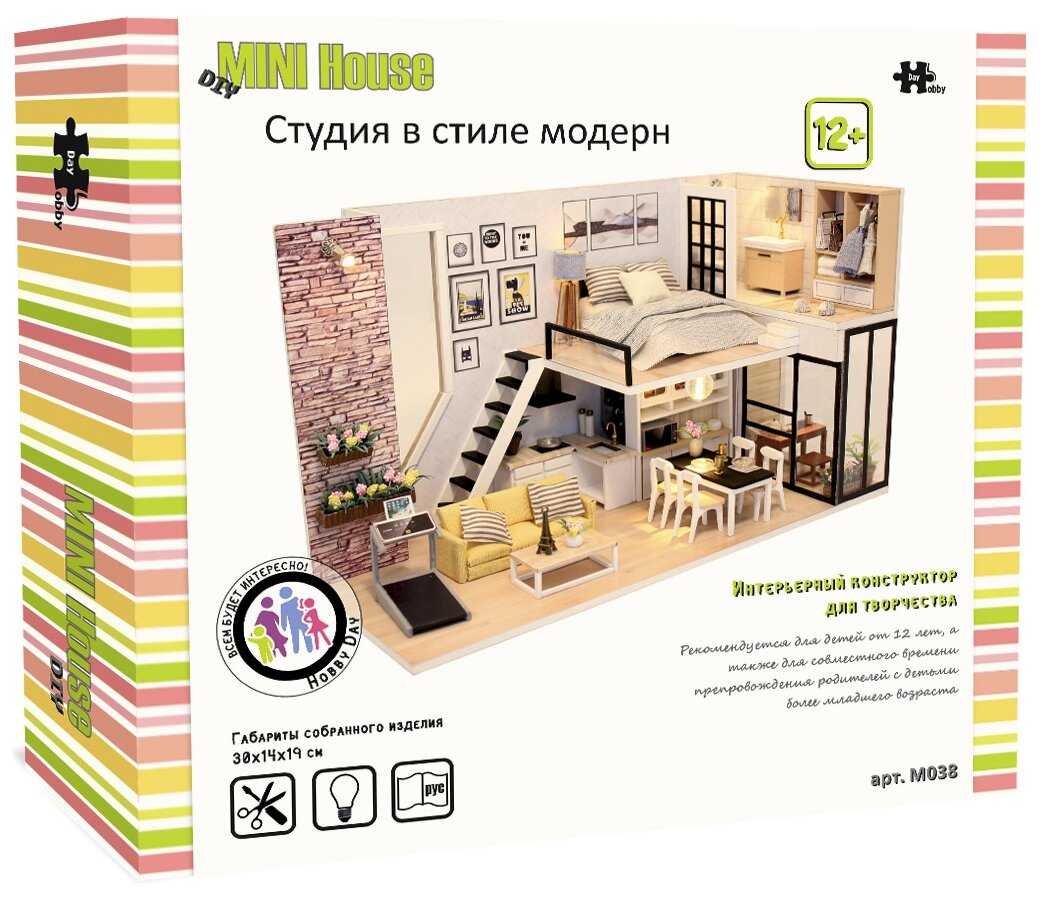 Румбокс DIY Mini House Hobby Day "Студия в стиле модерн" М038. - Создайте в миниатюре своё пространство и насладитесь своей работой. Студия в стиле модерн - конструктор, интерьер которого в мельчайших подробностях повторяет дизайн квартиры в модном европейском стиле. В миниатюрной студии есть светлая спальня, крошечный санузел, гардеробная, просторная гостиная с диванчиком и беговой дорожкой, уютная обеденная зона с современной бытовой техникой и стильной посудой и даже небольшая лаунж-зона.