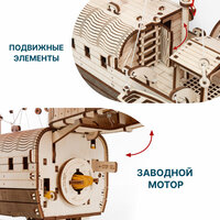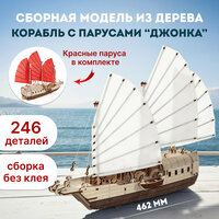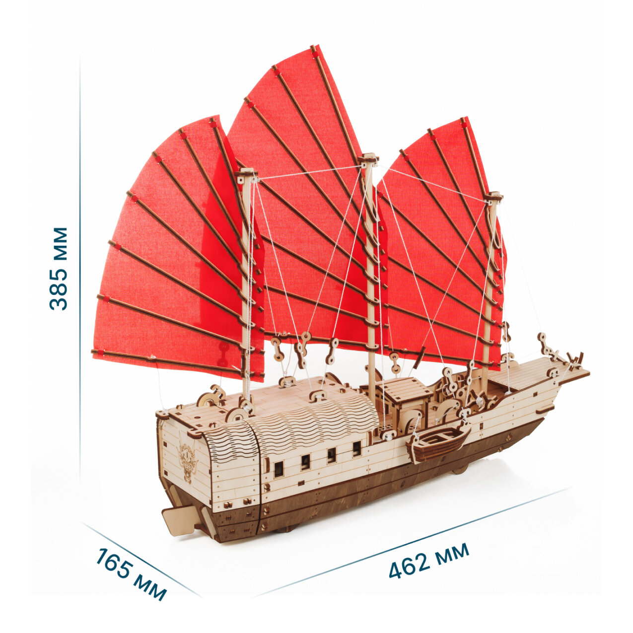 Сборная модель деревянного корабля EWA Джонка. Мы не можем называть наш парусник - деревянный конструктор, потому что в наша модель механическая с заводным двигателем на резинке. Джонка - это традиционное в юго-восточной Азии парусное судно для плавания по рекам и морским побережьям. Деревянный корабль большой по размеру, целых 46 см в длину и 39 см в высоту. Выглядит, как настоящий, с парусами, шлюпками, тросами и мачтами. Eco Wood Art выпускает первый деревянный корабль из фанеры. Этот корабль порадует всех и детей и взрослых и заядлых моделистов.