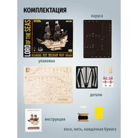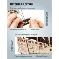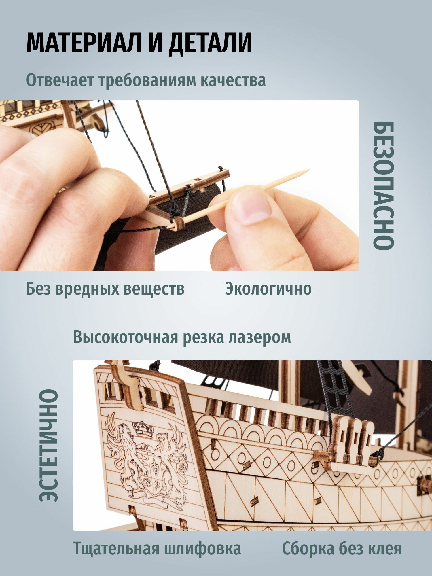 Сборная модель корабля «Владыка Морей» от Eco Wood Art: путешествие в мир парусников Откройте для себя удивительный мир мореплавания с деревянной моделью корабля «Владыка Морей» от торговой марки Eco Wood Art. Этот деревянный конструктор — идеальный выбор для любителей рукоделия и истории мореплавания. Деревянный корабль всегда отличный подарок для взрослого. Владыка морей может вам напоминать корабль Золотая Лань или корабль Черная Жемчужина. Особенности модели: - Материал: высококачественная берёзовая фанера, известная своей прочностью и долговечностью.- Паруса: изготовлены из ткани, что придаёт модели реалистичный вид. - Комплектация: в наборе вы найдёте всё необходимое для сборки, включая нити для вязки узлов, что позволит вам максимально погрузиться в процесс создания корабля. - Сборка: модель собирается без использования клея, что делает процесс сборки более удобным и приятным.- Размер: модель отличается большими размерами, что придаёт ей дополнительную внушительность и детализированность. Технические характеристики: - Размер коробки: 480х373х20 мм. - Размер собранной модели: 517х402х160 мм. - Вес собранной модели: 710 г. Эта сборная модель корабля не только порадует своим реалистичным видом, но и позволит насладиться увлекательным процессом сборки. Высокое качество изготовления и внимание к деталям делают «Владыку Морей» отличным выбором как для деревянных конструкторов для мальчиков, так и для взрослых любителей морских моделей. Сборная модель судна «Владыка Морей» станет прекрасным дополнением к коллекции деревянных парусников или оригинальным подарком для любителей мореплавания и рукоделия.