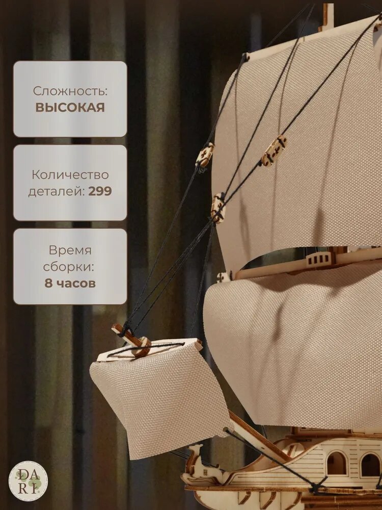 Деревянная модель корабля из дерева "Золотая Лань" от бренда Dariwood — это настоящее приключение в миниатюре, которое оживает в ваших руках. Именно на этом легендарном галеоне сэр Фрэнсис Дрейк совершил своё кругосветное плавание и вошёл в историю как один из самых известных капитанов эпохи Великих географических открытий. Конструктор из дерева — отличный подарок для ценителей морской романтики и коллекционеров. Конструктор для взрослых украсит любой интерьер и станет изюминкой вашей домашней коллекции. Собранная модель корабля "Золотая Лань" порадует реалистичной оснасткой парусов и такелажа, а также возможностью самостоятельной окраски — воплотите свою версию знаменитого галеона! С нашим конструктором деревянным справится любой — детали аккуратно вырезаны из качественной экологичной фанеры, а сборка не требует клея и не вызывает затруднений. Деревянный конструктор способствует развитию мелкой моторики, пространственного мышления, терпения и воображения. Проведите увлекательное время всей семьёй, создавая свою собственную легенду!