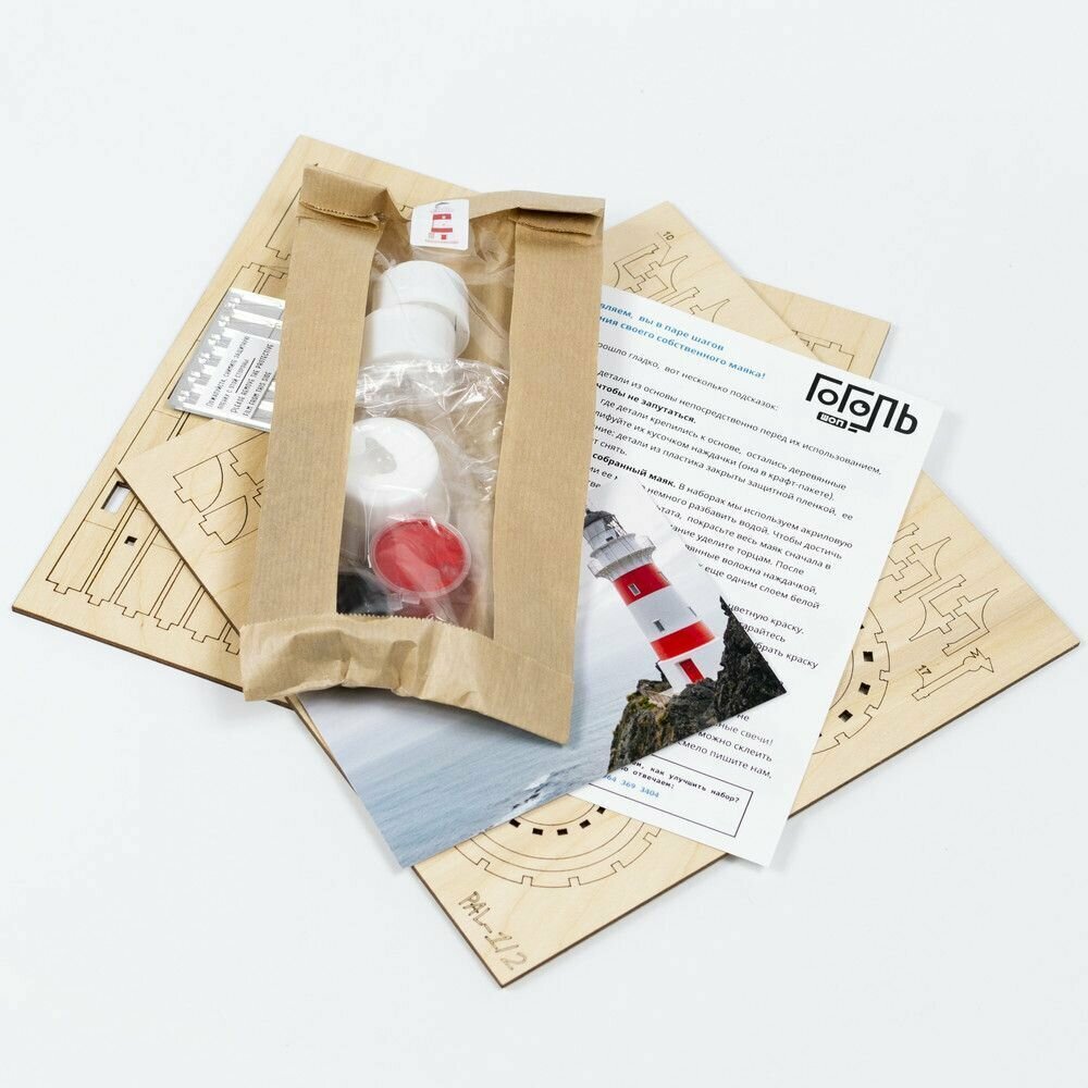 Деревянные детали для сборки; Стёклышки (оргстекло) для верхушки маяка; Краски (белая, черная, красная); Кисти (2 шт.); Электро-свечи (2 шт.); Наждачка; Открытка с фото настоящего маяка