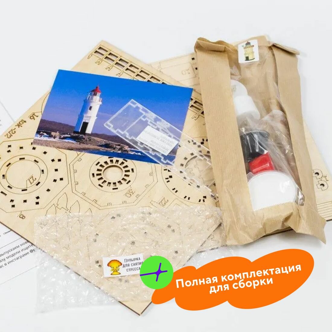 Что в наборе: деревянные детали для сборки (уже прорезаны) стёклышки для верхушки маяка (оргстекло) акриловые краски (белая, красная, черная) 2 кисти 2 электро-свечи наждачка инструкция по сборке и рекомендации по покраске открытка с фото настоящего маяка (и историческая справка об этом маяке на обороте)