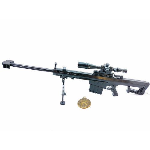 Миниатюрная модель известной крупнокалиберной снайперской винтовки изготовлена из металла с высокой степенью детализации. Модель полностью разбирается на части, близка к настоящей Barret m82. Имеет подвижные детали, затвор, спусковой крючок, сошки. Также вынимается магазин. С помощью рукоятки затвора можно дослать макет патрона в ствол, а также вынуть его. Также макеты патронов для винтовки Barret можно вставить в магазин. На модель винтовки можно установить прицел с лазерной подсветкой. Это прекрасный подарок для музея, коллекционера, ребёнка.