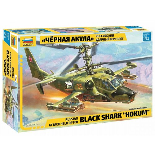 Сборная модель - Российский ударный вертолет " Черная акула". Этот вертолет является уникальным средством борьбы как с наземными, так и с воздушными целями. Это мощная хорошо бронированная машина, управляемая одним человеком. Применение соосной схемы расположения винтов дает вертолету отличную маневренность, позволяя ему перемещаться боком, лететь назад, практически мгновенно менять направление движения.