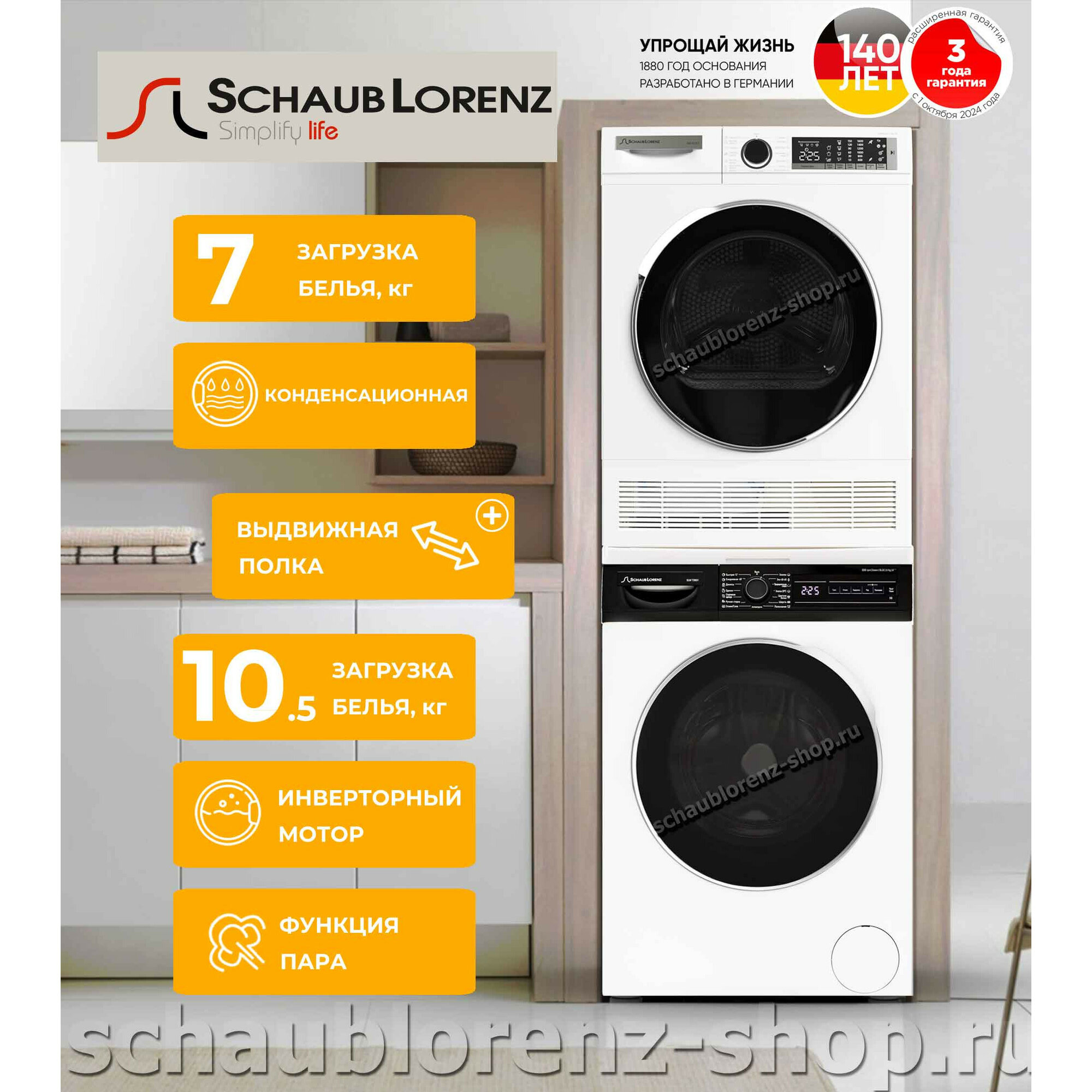 Schaub Lorenz комплект для установки в колонну Стиральная машина SLW T21021 + Сушильная машина SLR TC721T + Соединительный кит c выдвижной полкой: сравнение цен, характеристики, фото, актуальное наличие и цены.