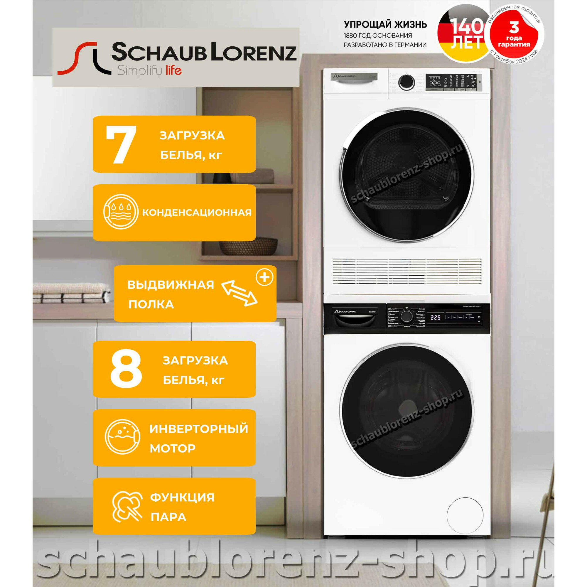 Schaub Lorenz комплект для установки в колонну Стиральная машина SLW T2821 + Сушильная машина SLR TC721T + Соединительный кит c выдвижной полкой: сравнение цен, характеристики, фото, актуальное наличие и цены.