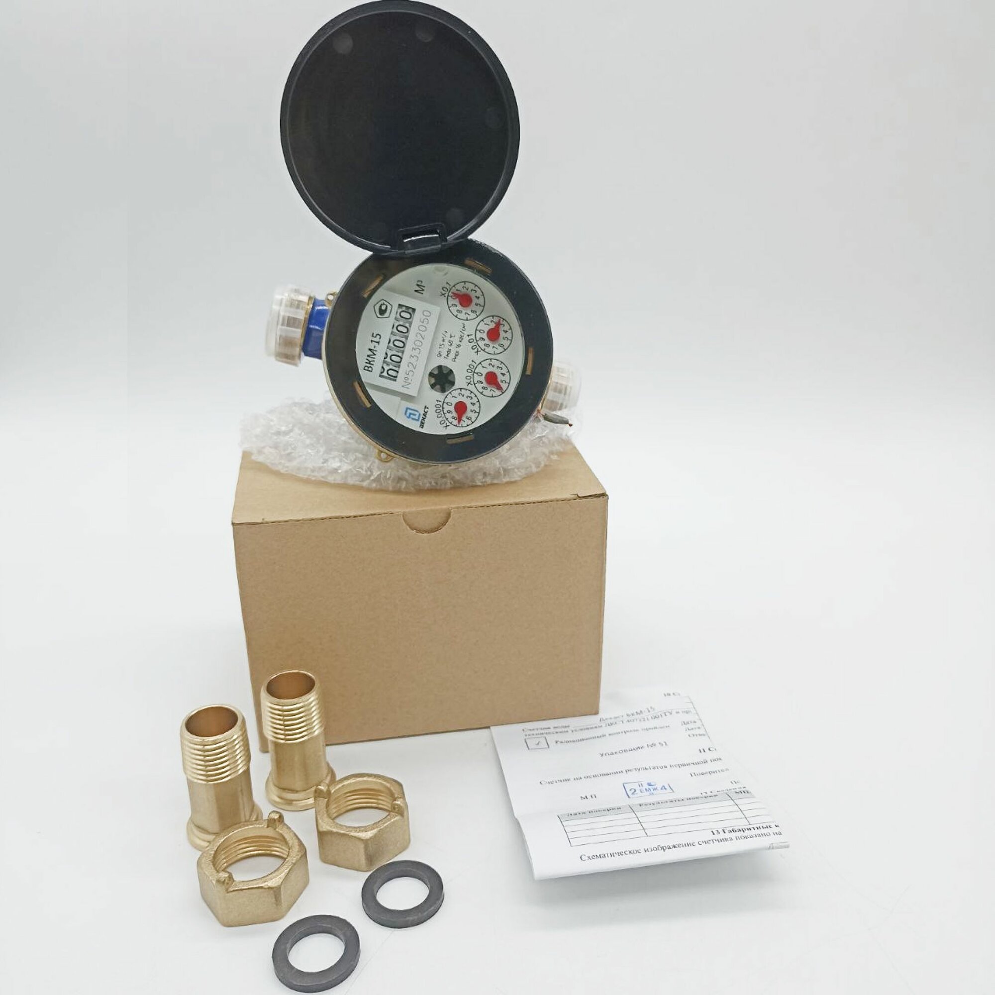 Счетчики воды мокроходы одноструйные муфтовые ВКМ-15 росич предназначены для коммерческого учета холодной воды по СНиП 2.04.07-86 и питьевой воды по ГОСТ 51232-98 , СанПиН 2.1.4.1 07 4-01 в бытовых и промышленных трубопроводах. Водосчетчики-мокроходы ВКМ-15 являются одноструйными мокроходами и принцип их действия основан на измерении числа оборотов крыльчатки, которая вращается со скоростью, пропорциональной расходу воды, протекающей по трубопроводу. Связь между счетным механизмом счетчика и крыльчаткой происходит через механическую передачу, при этом механизм счетчика заливается водой, которая служит смазкой для измерительного механизма. Для данного типа счетчиков разрешена эксплуатация, включая постоянную работу, в затапливаемых помещениях. Технические характеристики водосчетчиков ВКМ-15: Диаметр условного прохода: 15 мм Максимальное давление: 16 атм Измеряемая среда: питьевая вода по ГОСТ 51232-96 Температура рабочей среды: +5.+40С Метрологический класс: .