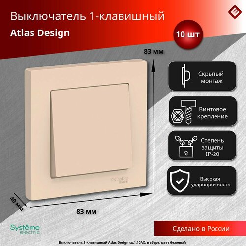 Schneider Electric AtlasDesign Выключатель 1-клавишный Бежевый сх.1, 10АХ, в сборе (комплект 10шт): сравнение цен, характеристики, фото, актуальное наличие и цены.