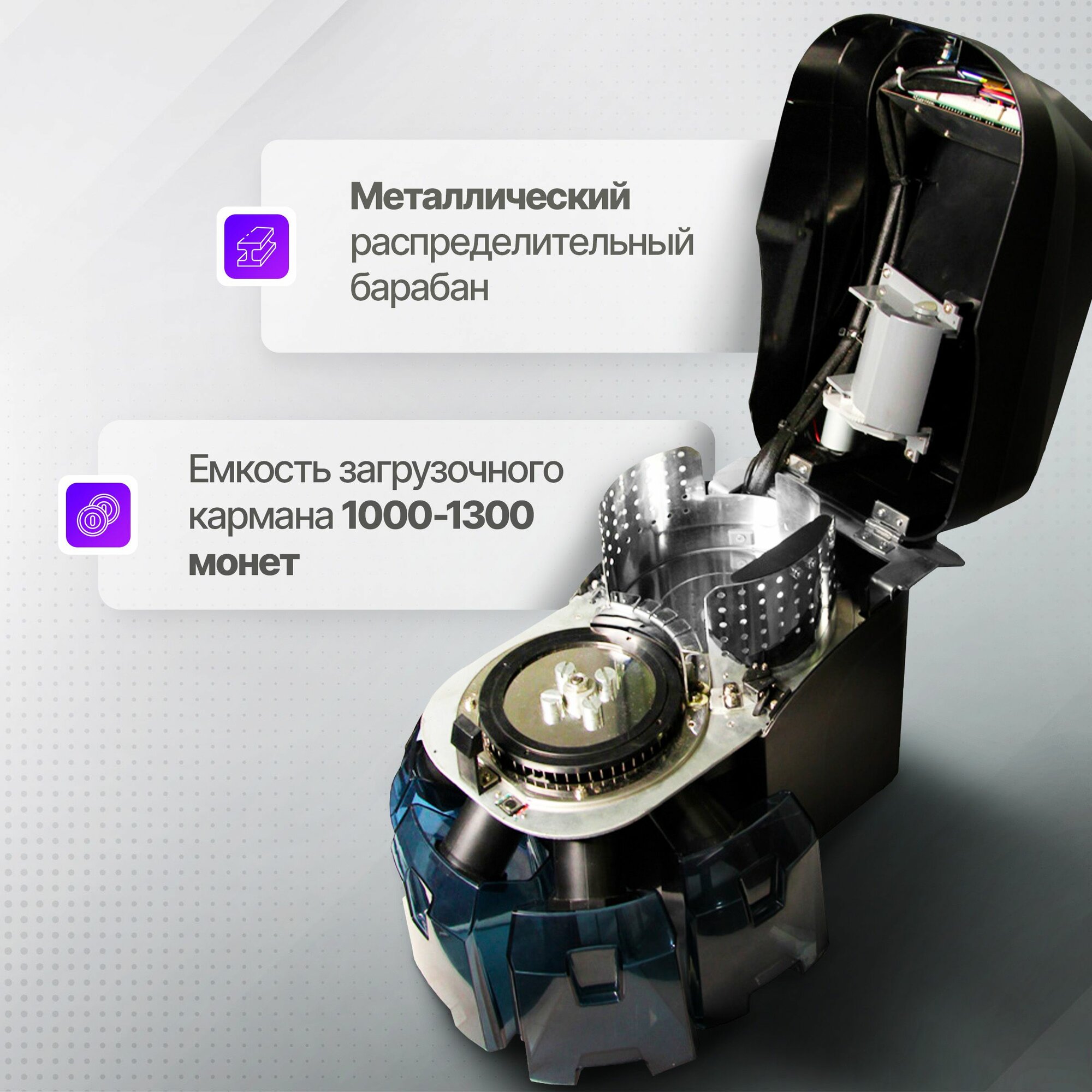Специальный автоматический датчик контролирует автоподачу и загрузку в бокс. Сортировочный диск из легированной стали, обеспечивает максимальную надежность и долговечность работы в сравнении с пластиковой запчастью. Скорость счёта 1000 - 1200 монет в минуту.