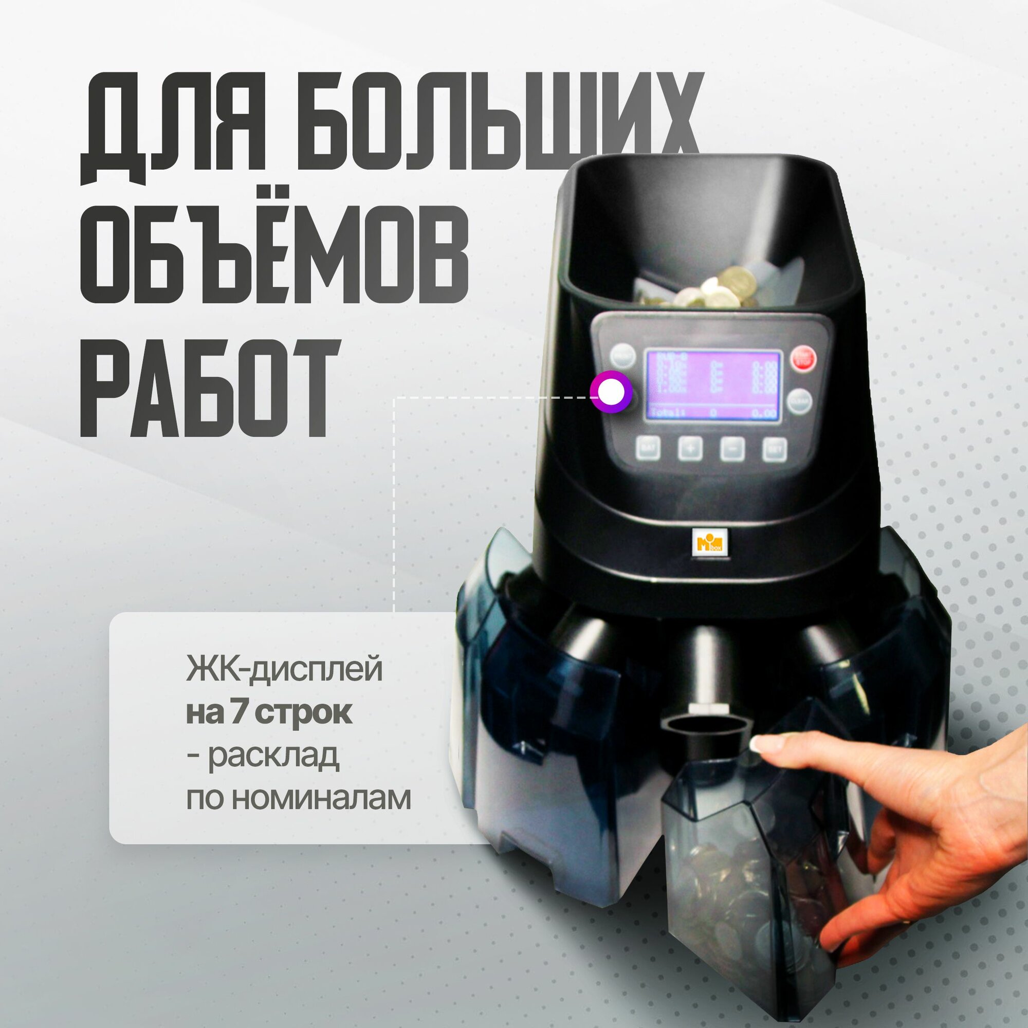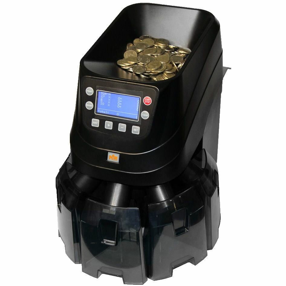 Предназначен для работы с большим количеством монет. Определяет номинал и сортирует согласно номиналу по карманам: 1, 2, 5, 10 рублей и все остальные. Всего пять приёмных лотков. Ёмкость боксов 250 - 550 монет. Размер фасовки программируется.