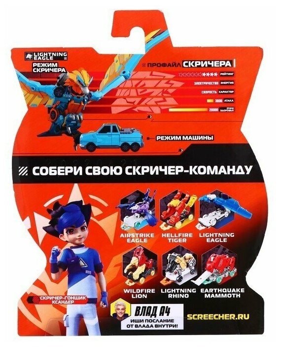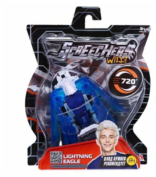 Машинка-трансформер «Screechers Wild. Лайтнинг Игл 720» Alpha Group 39855 разгоняется и делает стремительный кувырок не на 360°, а на 720°, самостоятельно трансформируясь прямо в воздухе! Двойное сальто на 720° - рекордная скорость и высота! Обратно в машинку игрушка собирается вручную. Несколько движений - и она готова к новому кувырку. Устраивать самые быстрые баттлы можно где угодно, теперь тебе не нужен скричер-диск для трансформации! Машинка-трансформер Лайтнинг Игл бренда «Дикие Скричеры» превращается в молниеносного орла, переворачиваясь в воздухе! Устрой баттл – стань крутым скричером! В набор входит машинка-трансформер (после трансформации: 8 х 5 х 13 см), коллекционная карточка.