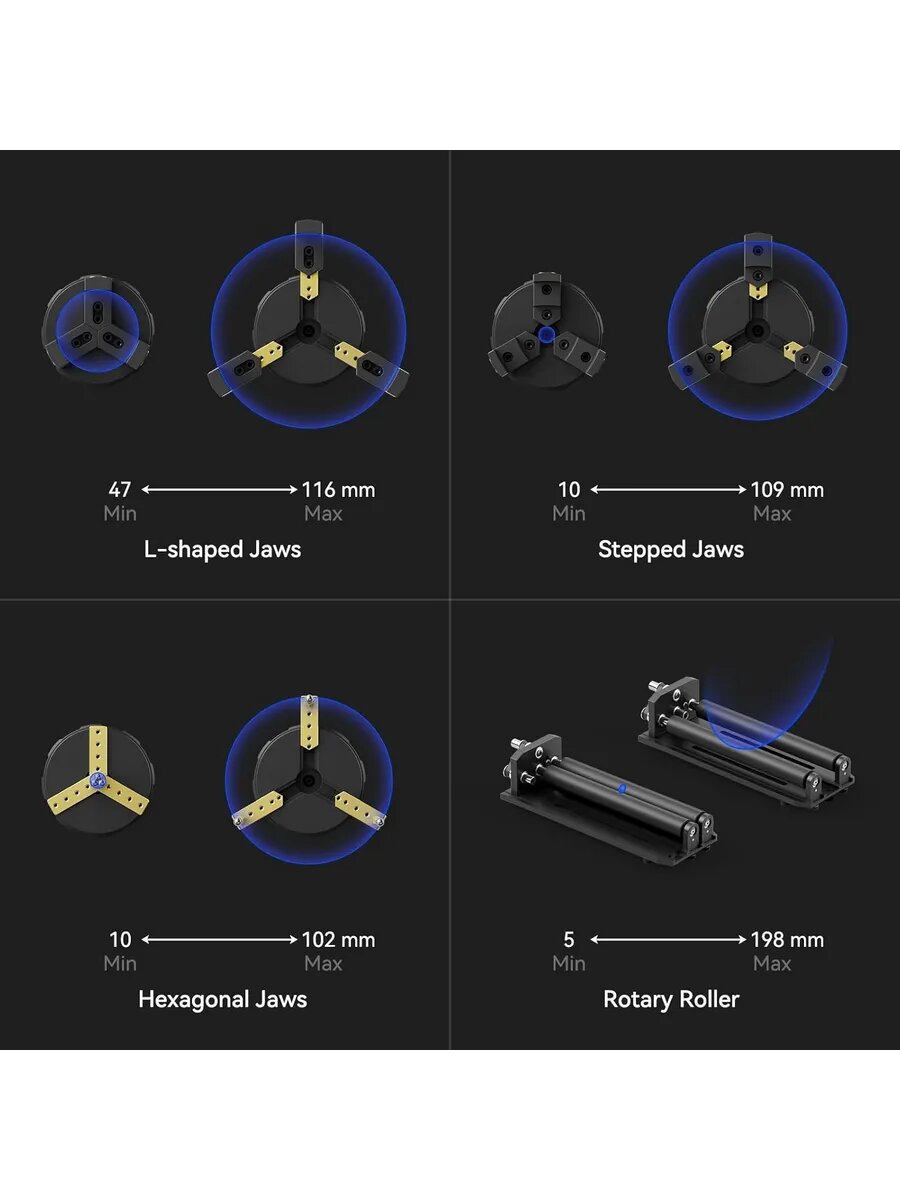 1. Многофункциональный вращающийся модуль: SCULPFUN RA Pro Max оснащен тремя наборами когтей (трапециевидные когти, Г-образные когти, шестиугольные когти). Меняя аксессуары, он может вырезать более нестандартные предметы, такие как винные бокалы, бейсбольные мячи, бейсбольные биты, стеклянные чашки, кружки с ручками и т. д. Это расширяет ваши творческие возможности и отвечает потребностям большего количества проектов по гравировке. (Примечание: RA Pro не предоставляет вращающийся ролик)