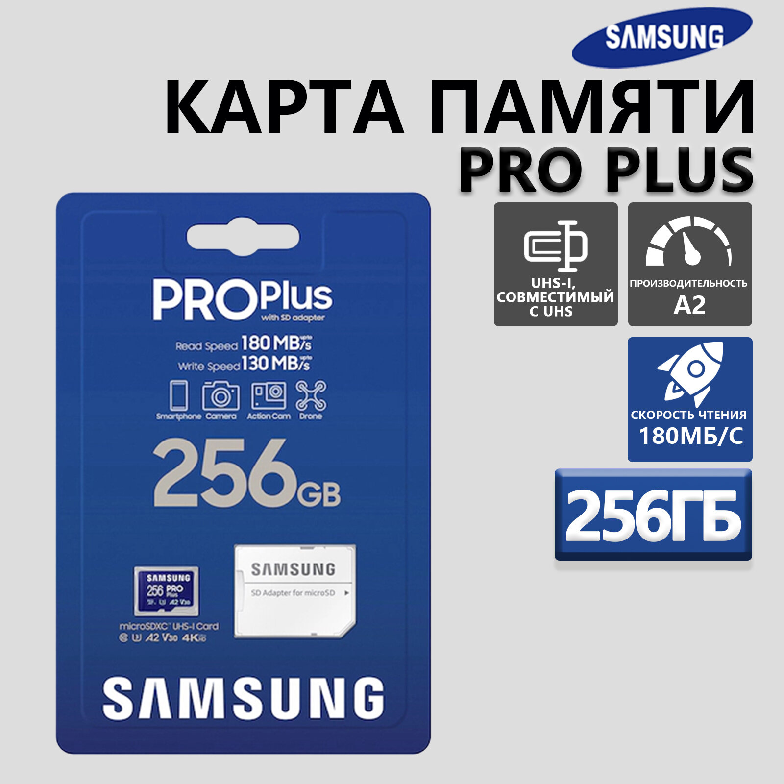 Купить SDXC UHS-I U3 Samsung Pro PLUS, 180 МБ/с, класс 10, 256 ГБ в упаковке с доставкой по всей России.