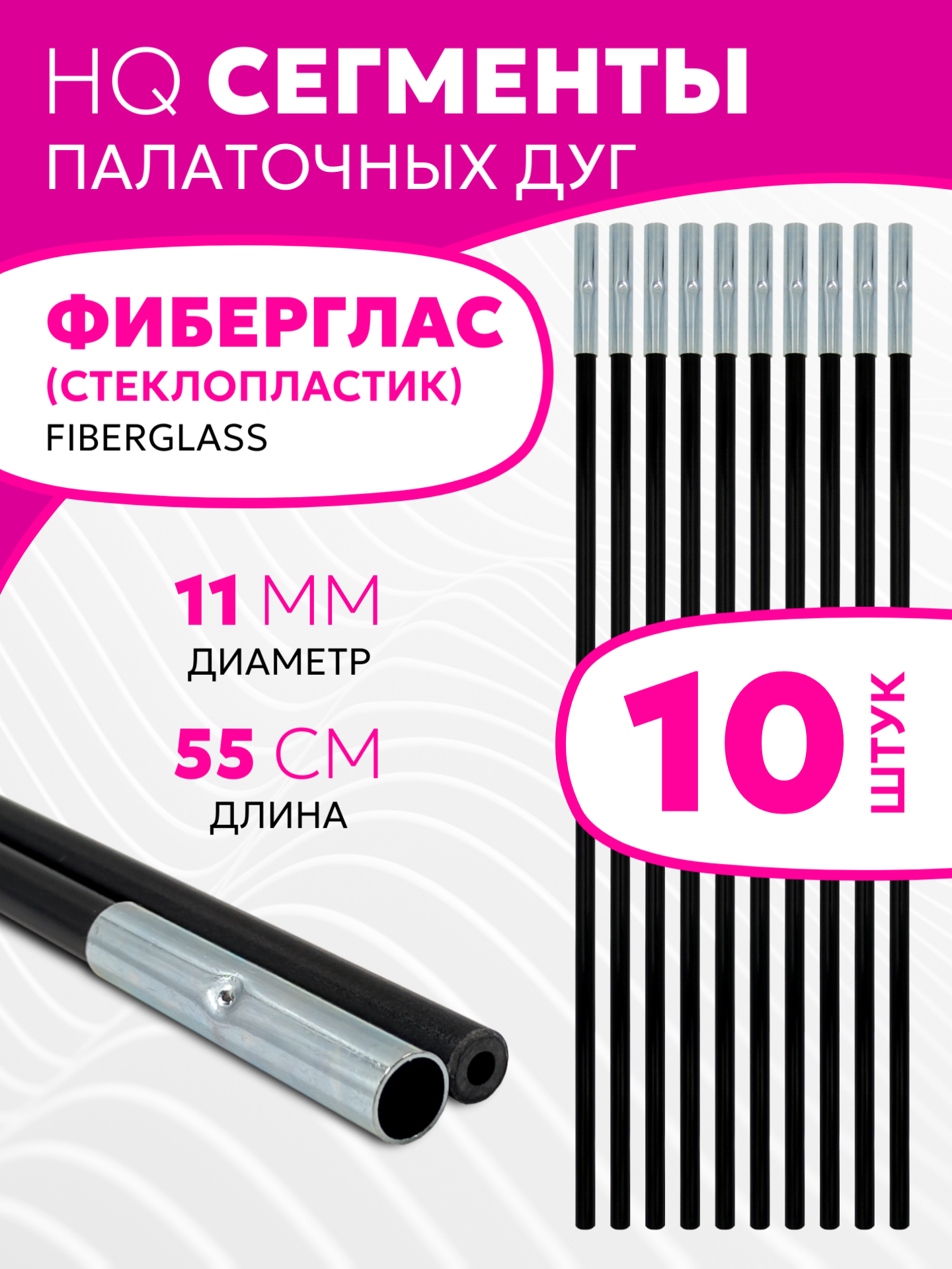 Высококачественные сегменты фибергласовых (стеклопластиковых) дуг для палатки. Диаметр 11 мм. Длина (с учётом стальной соединительной трубки) 55 см. В комплекте 10 штук. Подходят для большинства туристических палаток различных производителей.