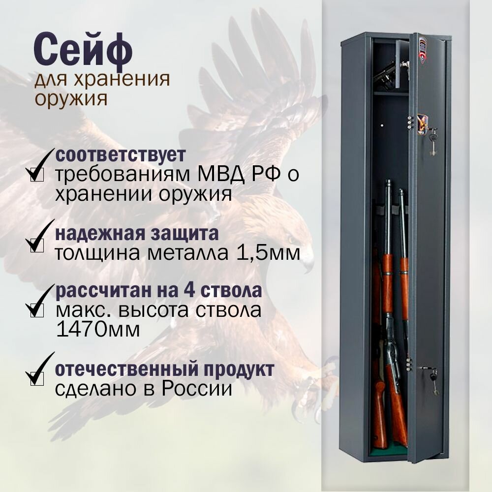 - Соответствует требованиям законодательства для хранения оружия.
