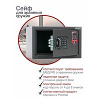 Предназначен для хранения короткоствольного и травматического оружия, пистолетов, холодного оружия (охотничьи ножи) в домашних условиях. Сейфы соответствуют требованиям ст.59 Постановления правительства РФ №814 от 21 июля 1998 года «О мерах по регулированию гражданского и служебного оружия и патронов к нему на территории РФ»; комплектуются электронным замком PLS-3.2 (ПРОМЕТ) + аварийный мастер-ключ