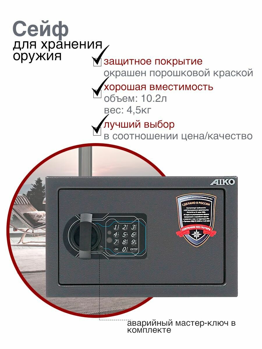 AIKO "TT-200" подходит для хранения короткоствольного и травматического оружия, пистолетов, а также холодного оружия (охотничьи ножи). Максимальная высота хранимого оружия составляет 20 см.