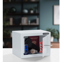 Сейф SAFEBURG SB-170КB WHITE - это идеальный выбор для хранения ценных вещей, ювелирных изделий, наличных денег, а также документов. Он имеет стильный дизайн, прочный корпус и небольшой размер, что делает его незаменимым элементом интерьера вашего дома или офиса. Сейф оснащен ключевым замком.