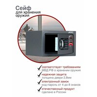 Предназначен для хранения короткоствольного и травматического оружия, пистолетов, холодного оружия (охотничьи ножи) в домашних условиях. Сейфы соответствуют требованиям ст.59 Постановления правительства РФ №814 от 21 июля 1998 года «О мерах по регулированию гражданского и служебного оружия и патронов к нему на территории РФ»; комплектуются электронным замком PLS-3.2 (ПРОМЕТ) + аварийный мастер-ключ
