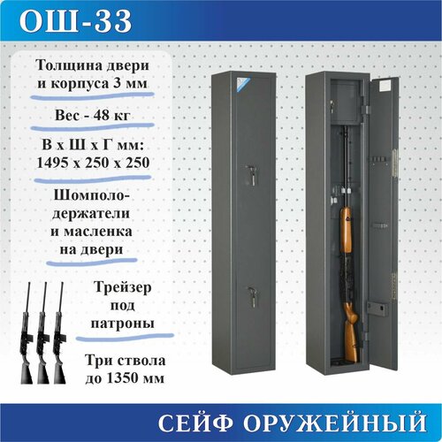 Сейф оружейный односекционный ОШ-33 сертифицирован по ГОСТ Р 55148-2012 (табл. 1). Класс устойчивости к взлому S1. Корпус сейфа толщиной 3 мм, дверь толщиной 3 мм. На задней стенке корпуса расположены отверстия для крепления. Сейф односекционный, на 3 ствола оснащен отделением под патроны. Максимальная высота устанавливаемого оружия — 1350 мм. Ложементы — металлические держатели с резиновыми роликами. Два замка ООО «Бордер» г. Рязань или аналогичные замки другого производителя. Цвет: Серый.