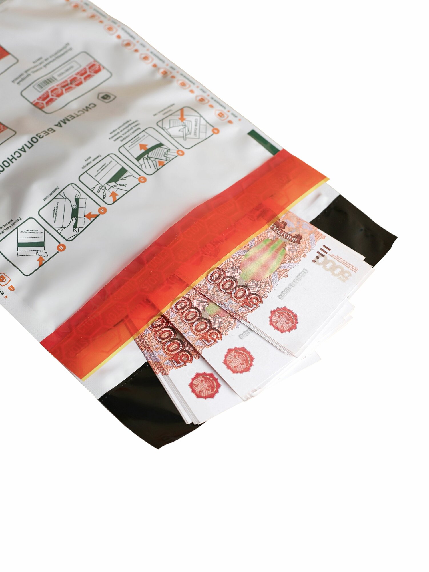 Сейф пакет производится из непрозрачного влагонепроницаемого, крепкого и плотного полиэтилена. Возможно использование при температурах от -40С до +60С. (температура при закрытии должна быть не ниже 0 градусов)