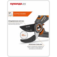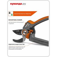 Секатор плоскостной DAEWOO DAGP 950 - это высококачественный инструмент, предназначенный для ухода за деревьями. Он обеспечивает точный и аккуратный рез благодаря своим уникальным характеристикам. Секатор оснащен плоскостными лезвиями из японской закаленной углеродистой стали SK-5. Они имеют прецизионную заточку, что гарантирует чистый и быстрый рез. Рукоятки инструмента выполнены из пластика и металла, что обеспечивает их прочность и долговечность. Покрытие рукояток из материала SoftGrip обеспечивает противоскользящий эффект, что делает работу с секатором более комфортной и безопасной. Секатор имеет фиксатор лезвий, который обеспечивает безопасность при хранении и транспортировке инструмента. Габариты секатора составляют 100х40х290 мм, а его вес - всего 0,29 кг. Это делает инструмент легким и удобным для работы. Секатор DAEWOO DAGP 950 выполнен в ярком оранжевом цвете, что делает его заметным на любой поверхности.