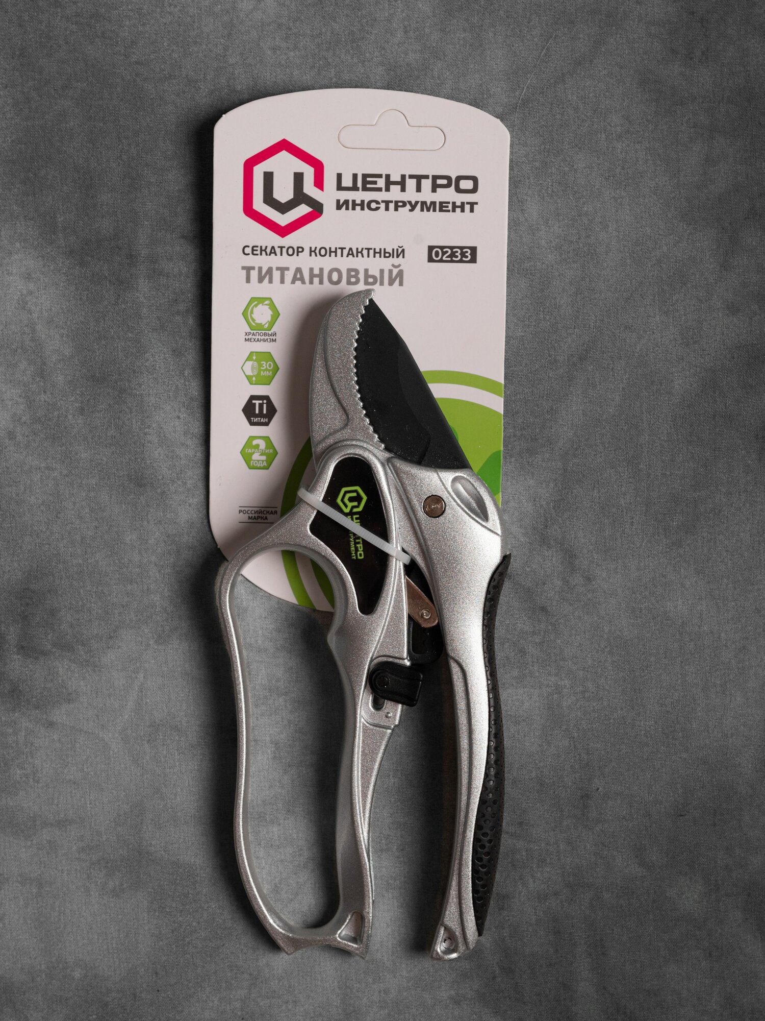 Секатор Центроинструмент 0233. Диаметр реза 30 мм. Для сырой и сухой древесины. Секатор титановый контактный с храповым механизмом 0233, Уникальный храповый механизм: рез в три этапа. Инструмент изготовлен из прочных, но в то же время легких материалов, в основе которых лежит титан. Лезвия изготовлены из высокоуглеродистой стали SK 5 с ANTISTICK покрытием. Закрытая рукоятка для надёжной защиты руки при работе. Вторая ручка с покрытием из термопластичной резины (TPR). Чистый рез. Увеличение режущей способности. Снижение прилагаемого усилия. Надёжный фиксатор обеспечивает безопасность в закрытом положении.