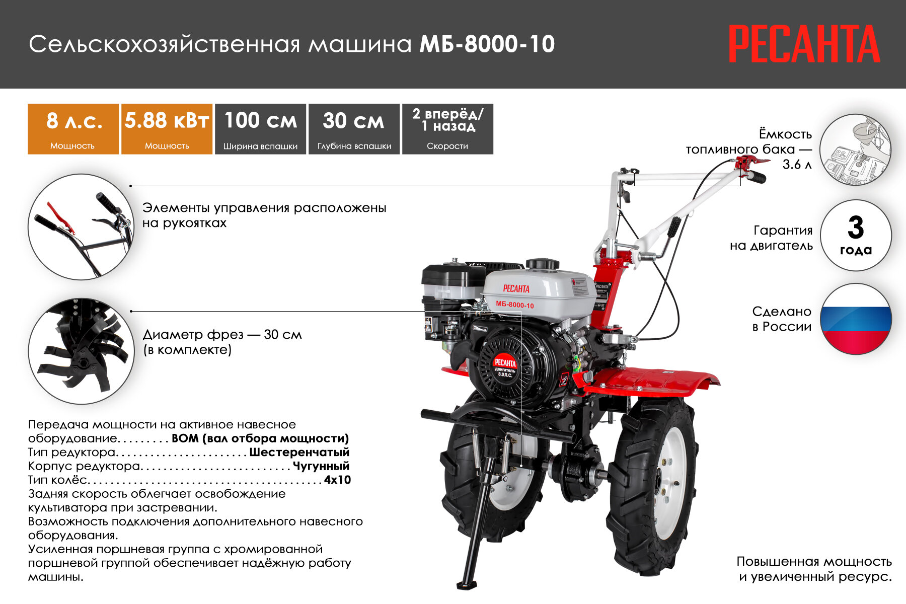 | Подробная комплектация | мотоблок, фрезы, ручка управления в сборе, подножка 1шт, сошник 1шт, пневмоколеса 2шт, защитные крылья 2шт, кронштейн для крепления навесного оборудования 1шт, комплект крепежа, паспорт(инструкция). |