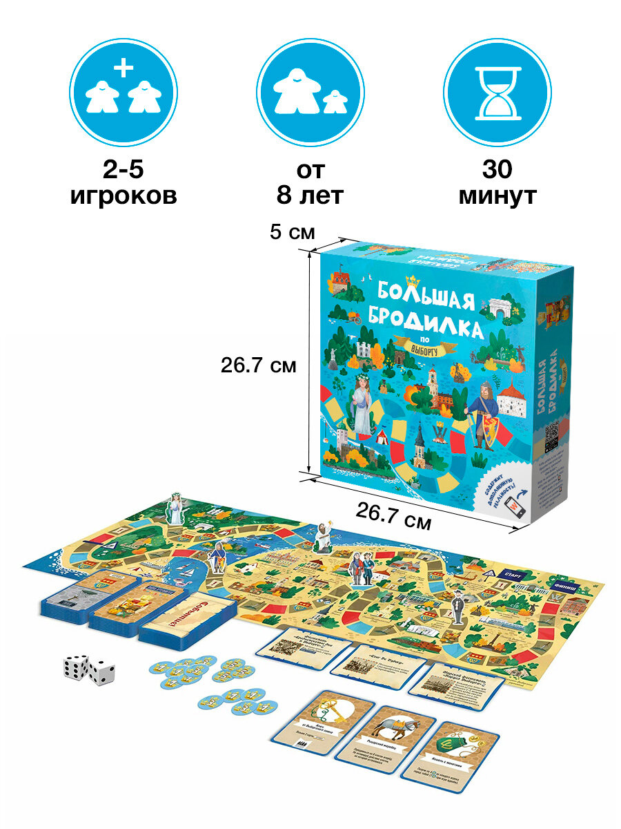 Большая Бродилка по Выборгу – это продолжение серии приключенческих игр Большая Бродилка, в ходе которой вы отправитесь на увлекательную прогулку по одному из самых красивых и знаменитых городов Ленинградской области. Вас все также ждет разноцветная извилистая тропинка, полная неожиданных событий, крутых поворотов и азартного состязания за титул победителя, но теперь на совершенно новом поле, с новыми событиями, правилами и даже с обновленными монетками! А еще коробка игры содержит элемент дополненной реальности – с помощью специального приложения вы сможете найти дополнительный путеводитель по району, найти интересную локацию на сайте и даже волшебным образом оживить объекты из игры. Бросайте кубики и вперед, навстречу приключениям!